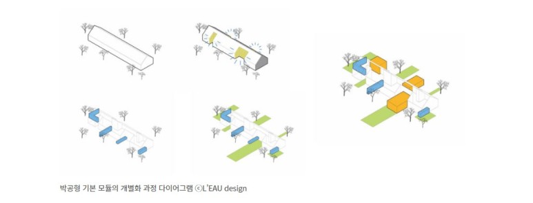 박공형의 볼륨은 방의 기능에 따라 향을 고려해 배치하되, 꽉 찬 볼륨을 부분적으로 덜어내고 보이드 공간으로 채워 내부로 자연을 삽입시키면서 기본형을 만들고, 추후 필요한 실들이 불륨으로 부가되어 시간에 따라 변형 가능한 생성적 구조를 만든다.