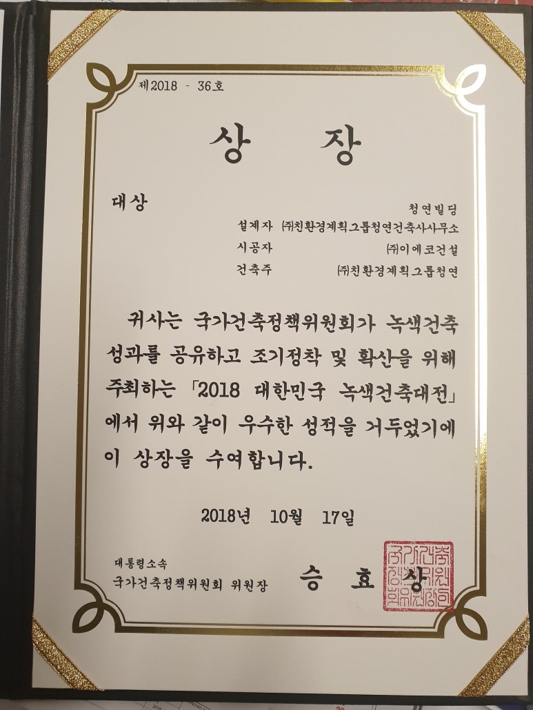 녹색건축대전에서 꼭대기의 대상! 그린리모델링 우수사례 공모전의 국토부장관상!! ^^ 그리고 위 표에는 없지만 "서울시 건축상 우수상"도 청연빌딩입니다.